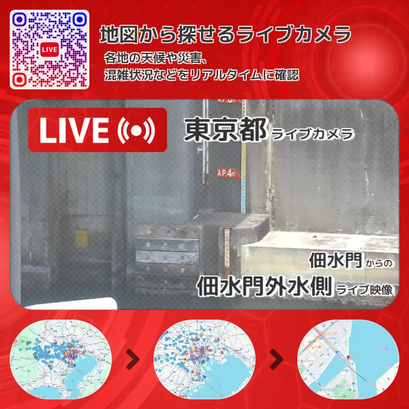佃水門外水側の他に、朝潮運河や周辺の気象状況も併せてチェックすることが可能で、台風・大雨・地震などの災害による被害状況も把握することができます。