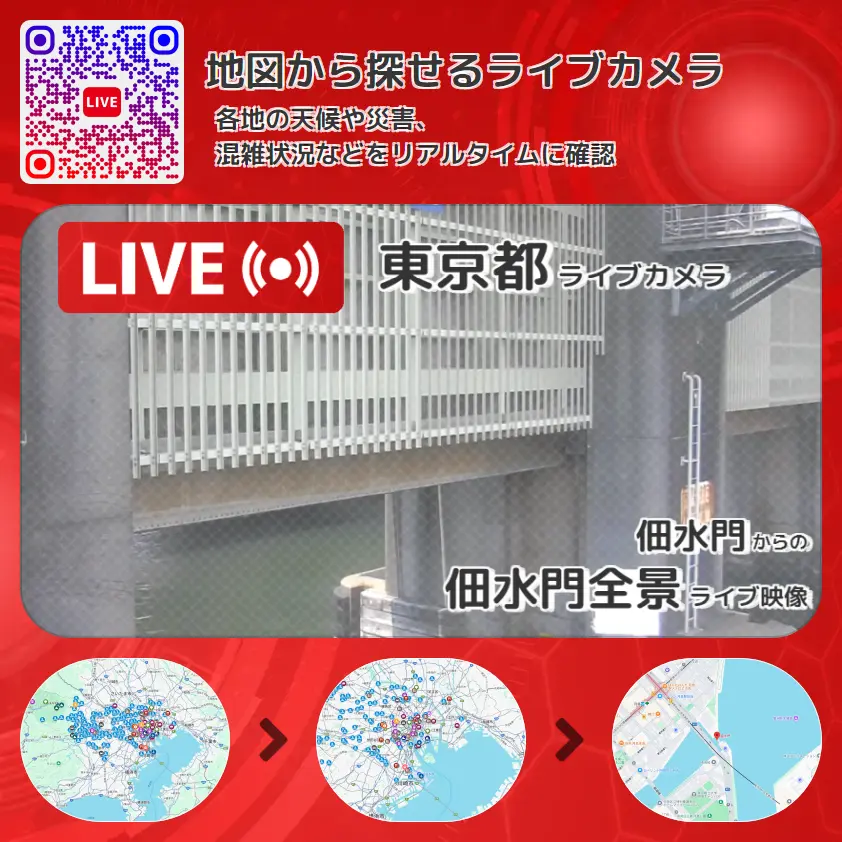 佃水門全景の他に、朝潮運河や周辺の気象状況も併せてチェックすることが可能で、台風・大雨・地震などの災害による被害状況も把握することができます。