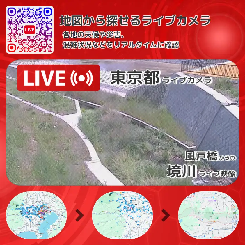 周辺の気象状況も併せてチェックすることが可能で、台風・大雨・地震などの災害による被害状況も把握することができます。