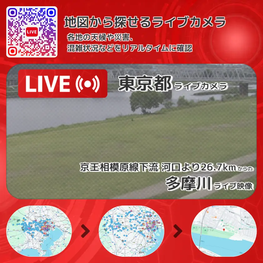 多摩川の他に、調布花火大会京王多摩川会場や周辺の気象状況も併せてチェックすることが可能で、台風・大雨・地震などの災害による被害状況も把握することができます。