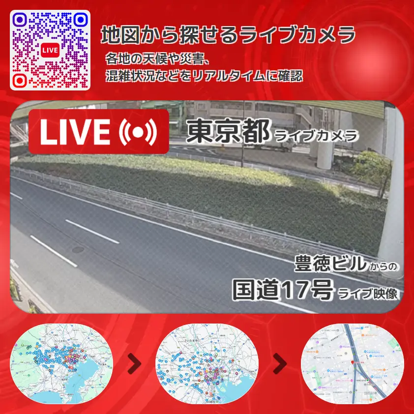 国道17号(中山道)の他に、山手通りや周辺の気象状況も併せてチェックすることが可能で、台風・大雨・地震などの災害による被害状況も把握することができます。