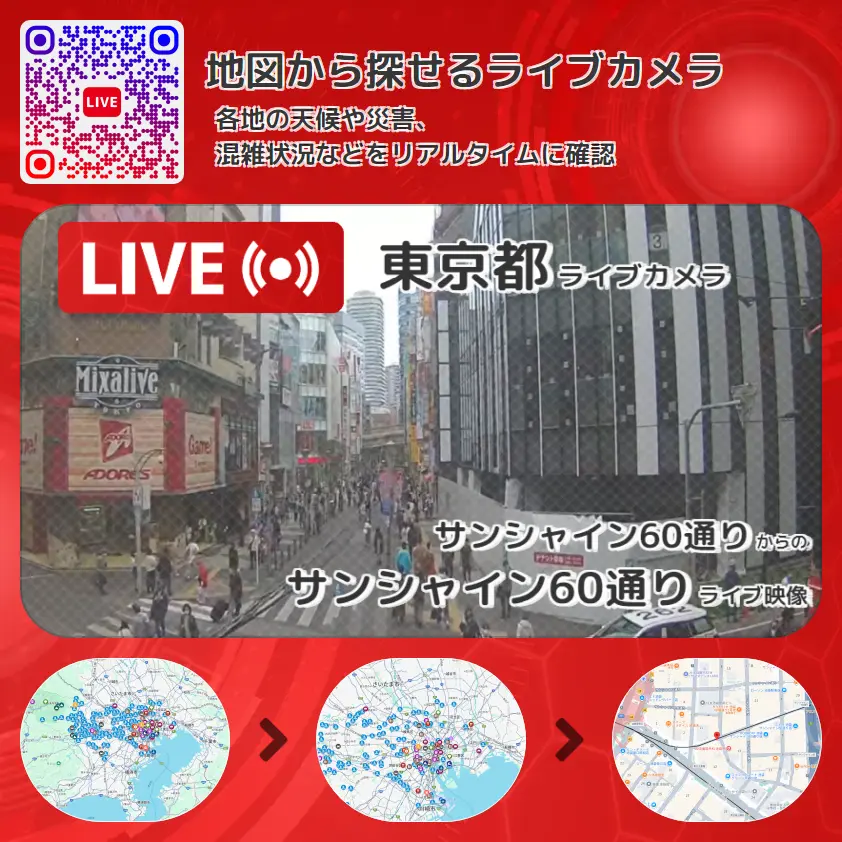 サンシャイン60通りの他に、池袋駅東口付近や周辺の気象状況も併せてチェックすることが可能で、台風・大雨・地震などの災害による被害状況も把握することができます。