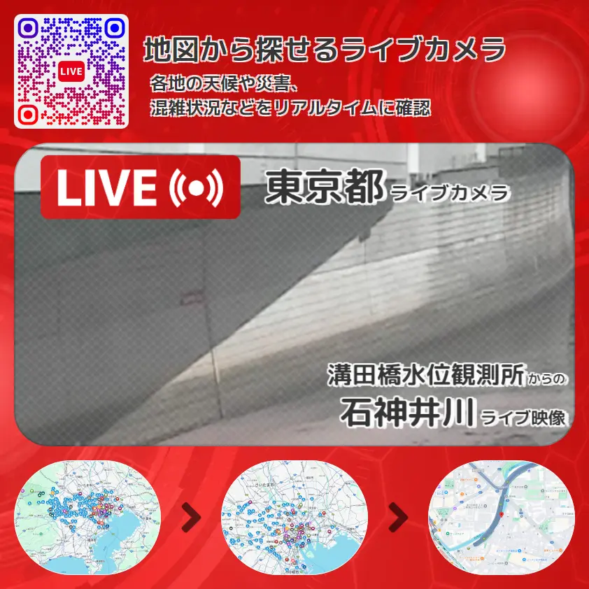石神井川の他に、溝田橋や周辺の気象状況も併せてチェックすることが可能で、台風・大雨・地震などの災害による被害状況も把握することができます。