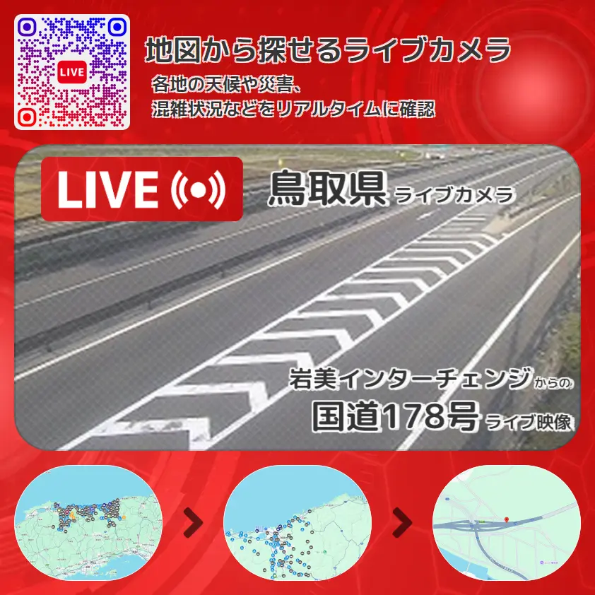 国道178号の他に、山陰近畿自動車道(山陰近畿道)や周辺の気象状況も併せてチェックすることが可能で、台風・大雨・地震などの災害による被害状況も把握することができます。
