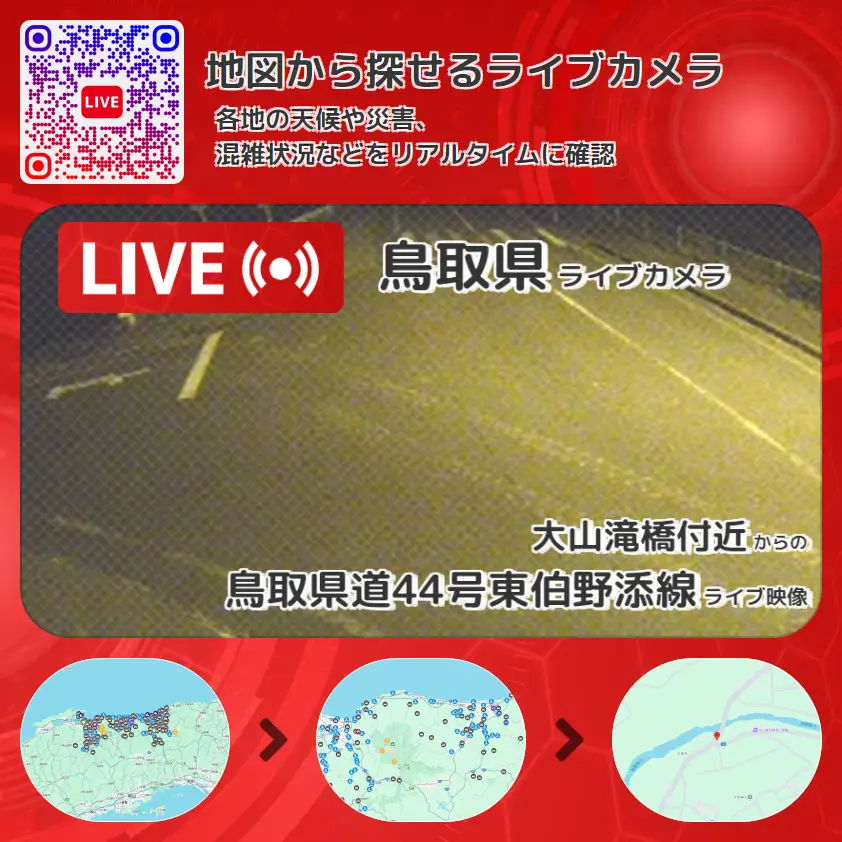 鳥取県道44号東伯野添線(大山環状道路)の他に、鳥取県道313号下見関金線や周辺の気象状況も併せてチェックすることが可能で、台風・大雨・地震などの災害による被害状況も把握することができます。