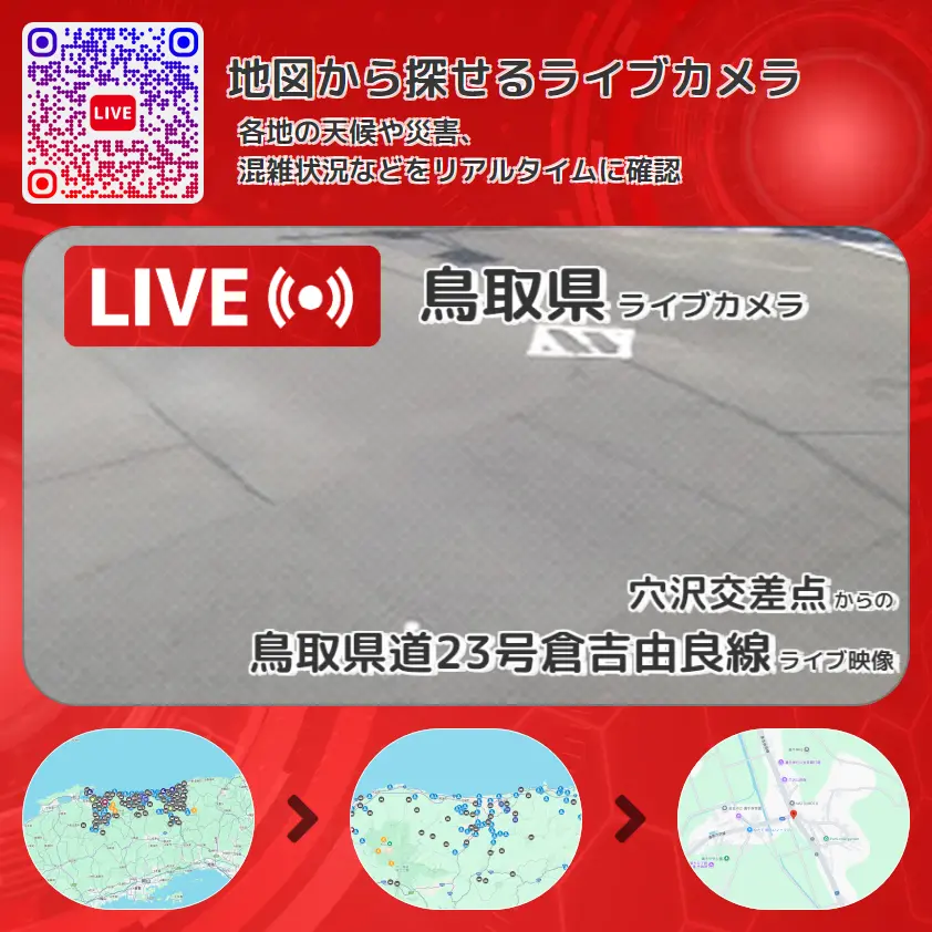 鳥取県道23号倉吉由良線の他に、鳥取県道202号津原穴沢線や周辺の気象状況も併せてチェックすることが可能で、台風・大雨・地震などの災害による被害状況も把握することができます。