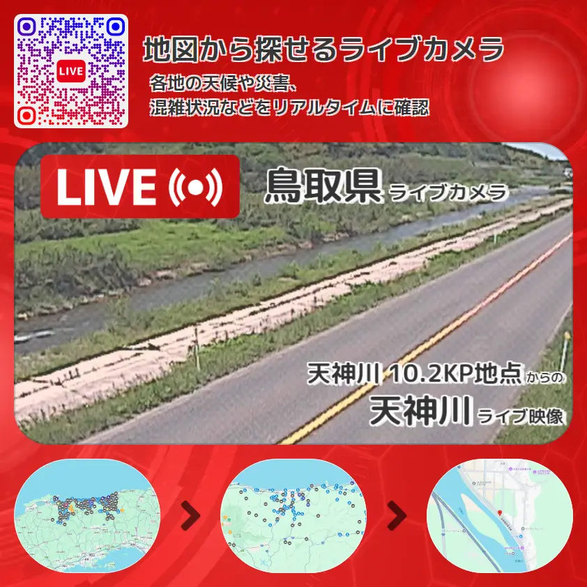 天神川の他に、鳥取県道21号鳥取鹿野倉吉線や周辺の気象状況も併せてチェックすることが可能で、台風・大雨・地震などの災害による被害状況も把握することができます。