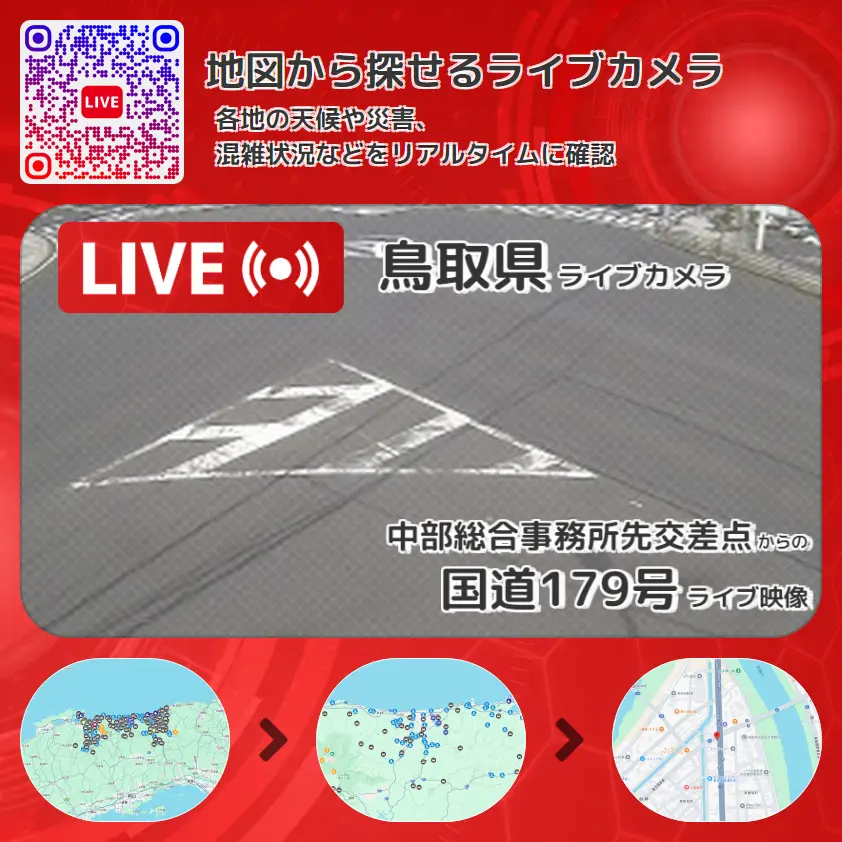 国道179号の他に、鳥取県道21号鳥取鹿野倉吉線や周辺の気象状況も併せてチェックすることが可能で、台風・大雨・地震などの災害による被害状況も把握することができます。