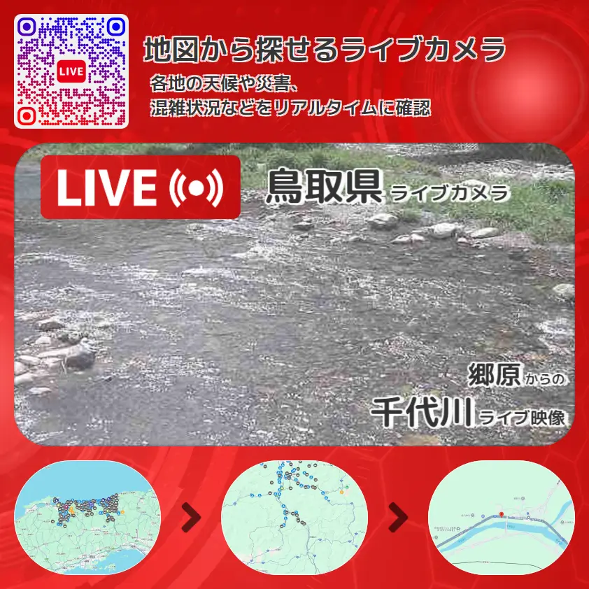 千代川の他に、郷原橋や周辺の気象状況も併せてチェックすることが可能で、台風・大雨・地震などの災害による被害状況も把握することができます。
