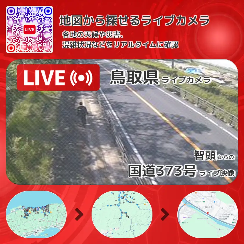 国道373号の他に、千代川や周辺の気象状況も併せてチェックすることが可能で、台風・大雨・地震などの災害による被害状況も把握することができます。