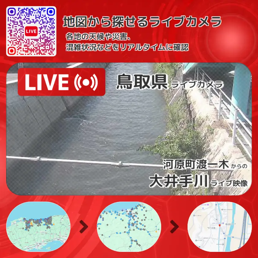 大井手川の他に、鳥取市立河原第一小学校付近や周辺の気象状況も併せてチェックすることが可能で、台風・大雨・地震などの災害による被害状況も把握することができます。