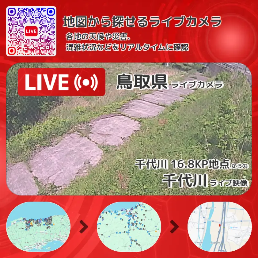 千代川の他に、河原橋や周辺の気象状況も併せてチェックすることが可能で、台風・大雨・地震などの災害による被害状況も把握することができます。