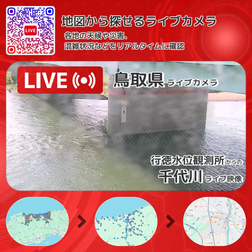 千代川の他に、新千代橋や周辺の気象状況も併せてチェックすることが可能で、台風・大雨・地震などの災害による被害状況も把握することができます。
