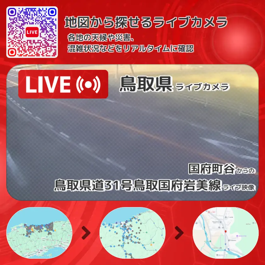 鳥取県道31号鳥取国府岩美線の他に、鳥取県道282号麻生国府線や周辺の気象状況も併せてチェックすることが可能で、台風・大雨・地震などの災害による被害状況も把握することができます。
