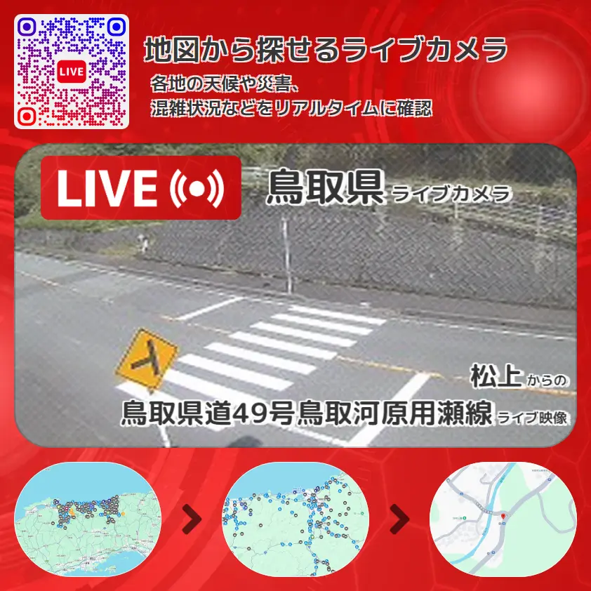 鳥取県道49号鳥取河原用瀬線の他に、鳥取県道32号郡家鹿野気高線や周辺の気象状況も併せてチェックすることが可能で、台風・大雨・地震などの災害による被害状況も把握することができます。