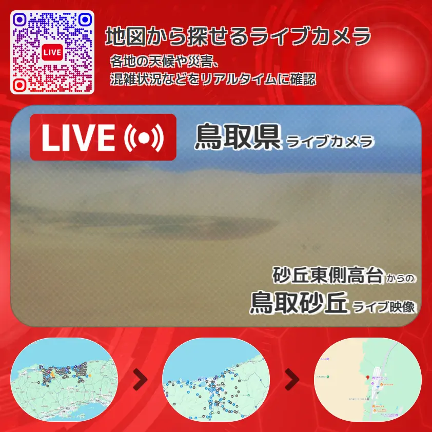 鳥取砂丘(砂防林・馬の背・オアシス)の他に、日本海や周辺の気象状況も併せてチェックすることが可能で、台風・大雨・地震などの災害による被害状況も把握することができます。