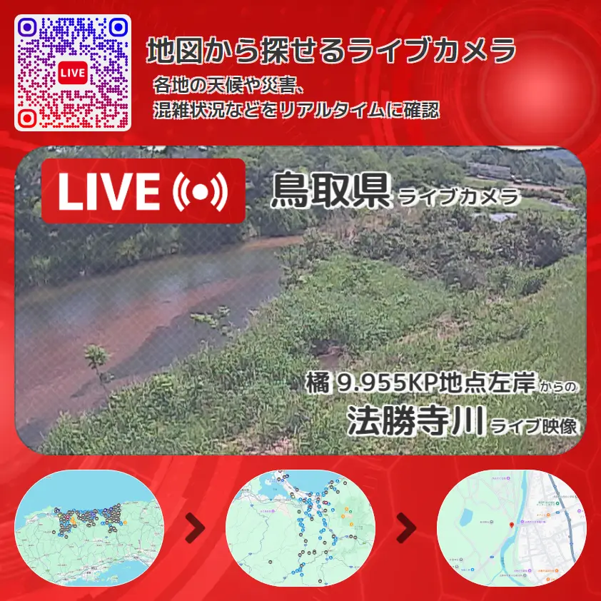 法勝寺川の他に、鳥取県道104号西伯伯太線や周辺の気象状況も併せてチェックすることが可能で、台風・大雨・地震などの災害による被害状況も把握することができます。