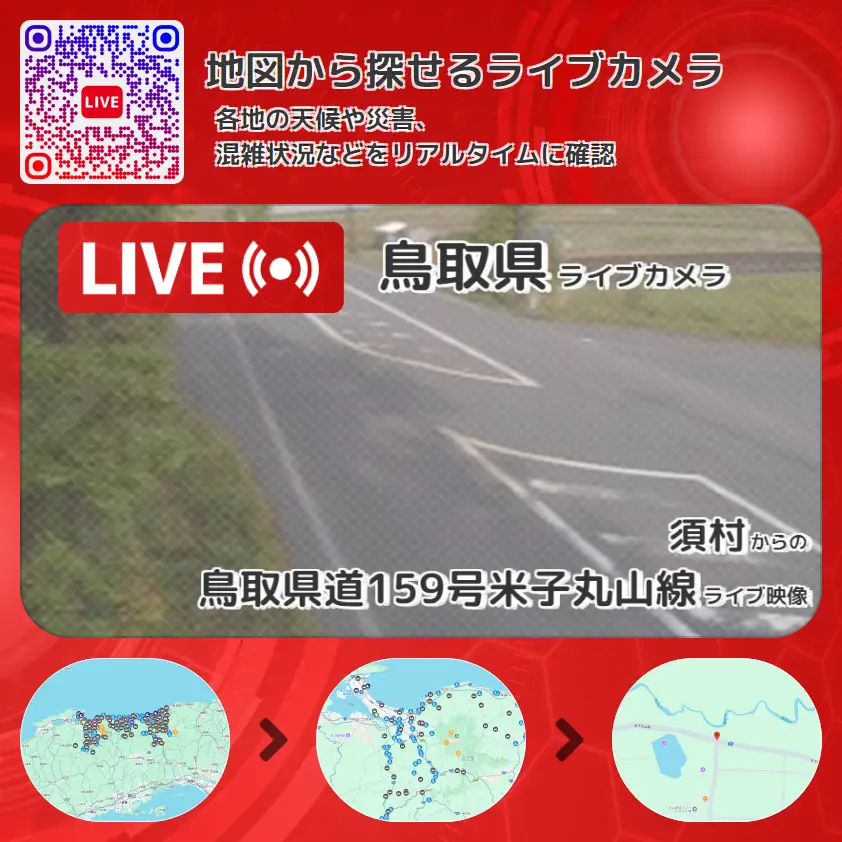 鳥取県道159号米子丸山線の他に、福岡堤付近や周辺の気象状況も併せてチェックすることが可能で、台風・大雨・地震などの災害による被害状況も把握することができます。
