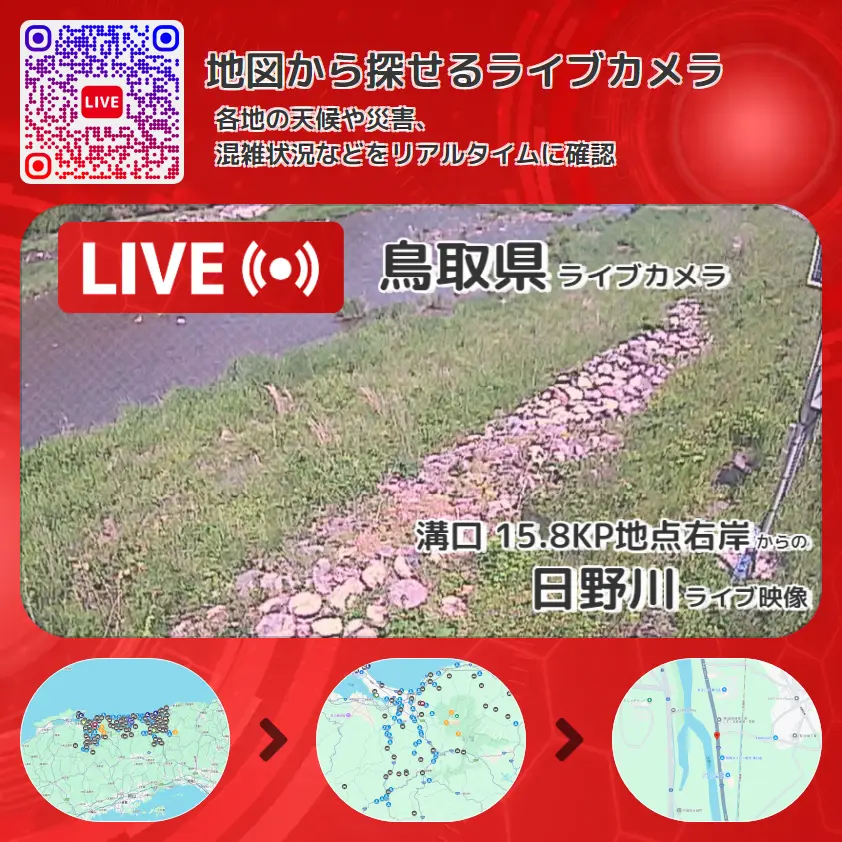日野川の他に、国道181号や周辺の気象状況も併せてチェックすることが可能で、台風・大雨・地震などの災害による被害状況も把握することができます。