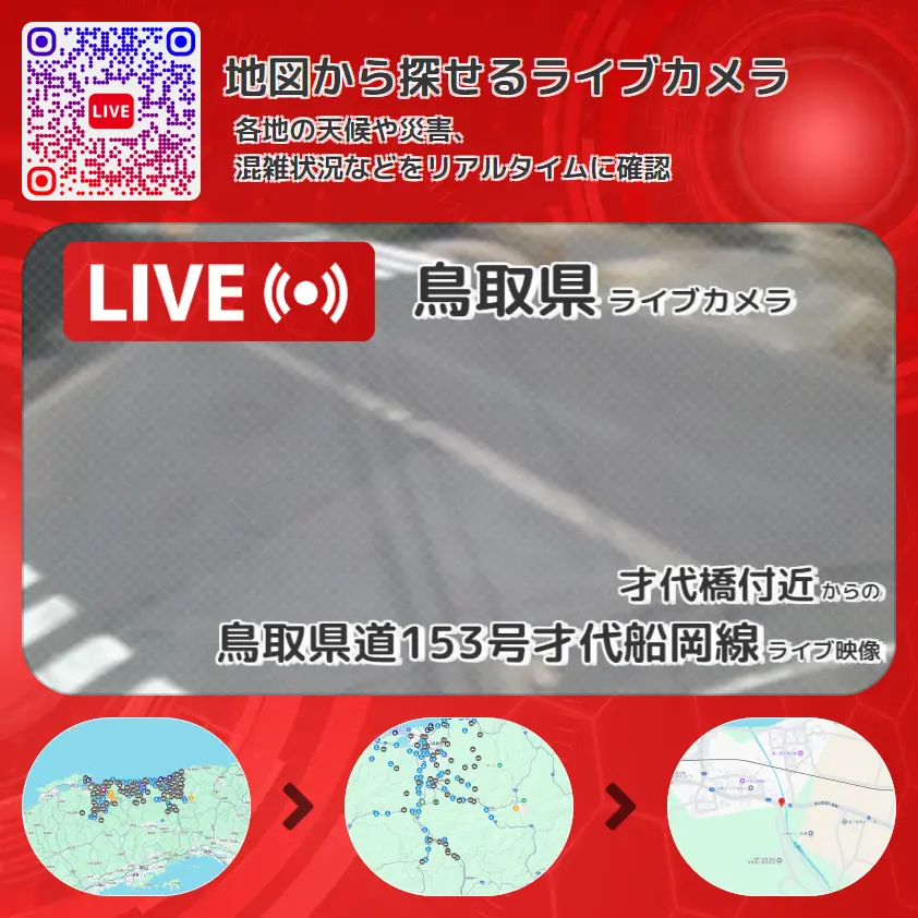 鳥取県道153号才代船岡線の他に、鳥取県道6号津山智頭八東線や周辺の気象状況も併せてチェックすることが可能で、台風・大雨・地震などの災害による被害状況も把握することができます。
