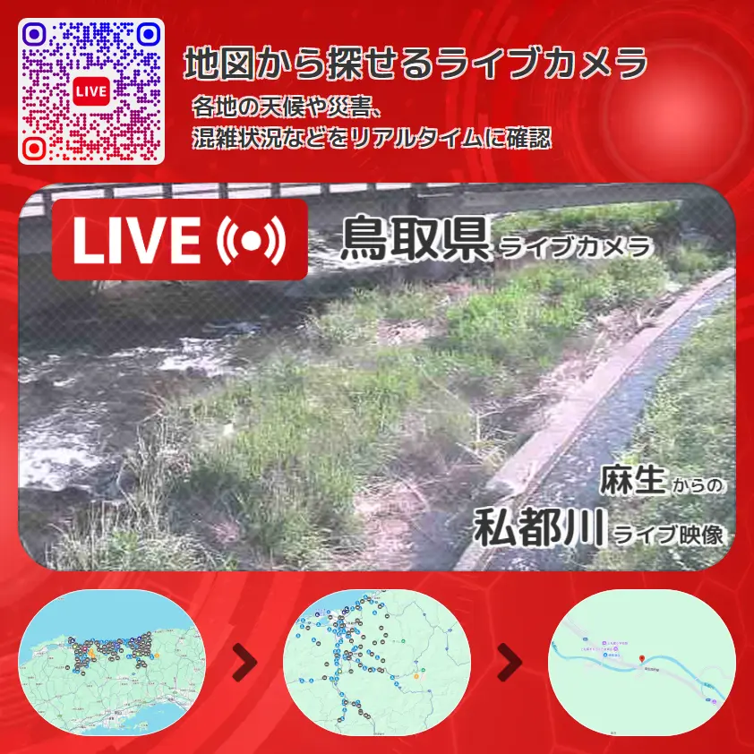 私都川の他に、鳥取県道282号麻生国府線や周辺の気象状況も併せてチェックすることが可能で、台風・大雨・地震などの災害による被害状況も把握することができます。