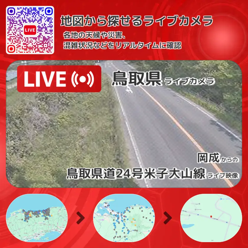 鳥取県道24号米子大山線の他に、岡成池付近や周辺の気象状況も併せてチェックすることが可能で、台風・大雨・地震などの災害による被害状況も把握することができます。