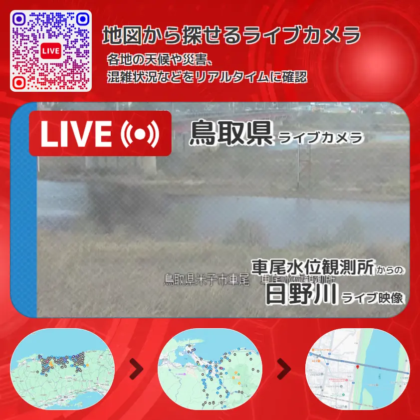 車尾水位観測所から、日野川(日野川水系)が確認できるライブカメラです。