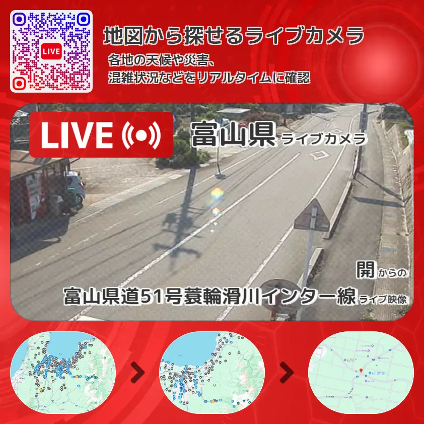 富山県道51号蓑輪滑川インター線の他に、滑川市立博物館付近や周辺の気象状況も併せてチェックすることが可能で、台風・大雨・地震などの災害による被害状況も把握することができます。