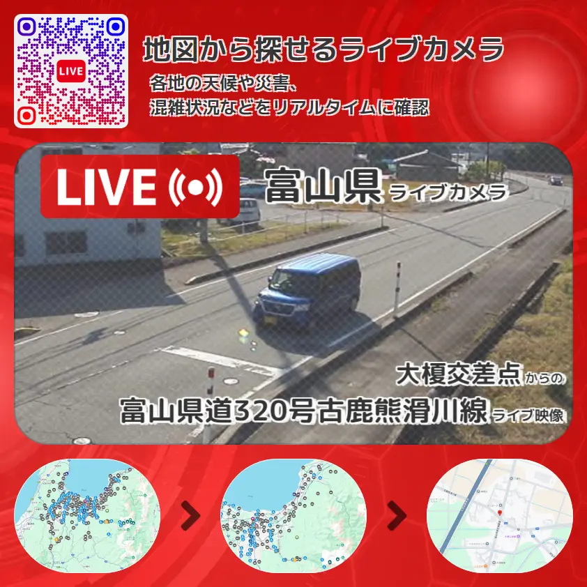富山県道320号古鹿熊滑川線の他に、大榎交差点や周辺の気象状況も併せてチェックすることが可能で、台風・大雨・地震などの災害による被害状況も把握することができます。