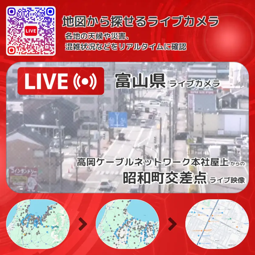 昭和町交差点の他に、富山県道64号高岡氷見線(昭和通り)や周辺の気象状況も併せてチェックすることが可能で、台風・大雨・地震などの災害による被害状況も把握することができます。