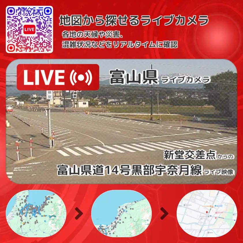 新堂交差点から、富山県道14号黒部宇奈月線が確認できるライブカメラです。