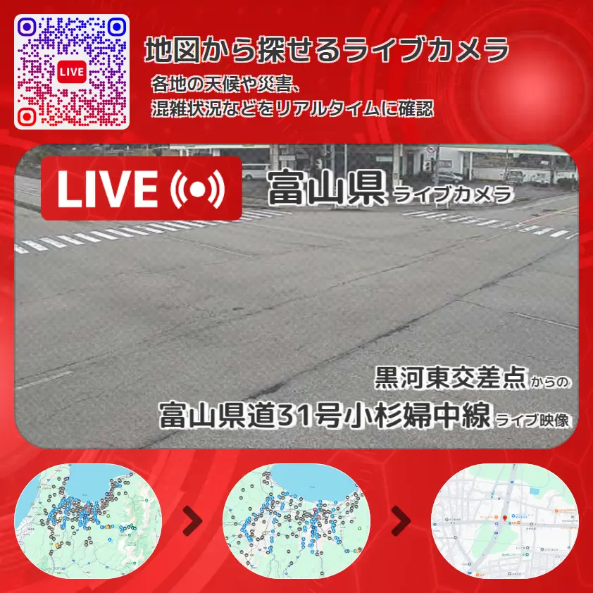 富山県道31号小杉婦中線の他に、富山県道9号富山戸出小矢部線や周辺の気象状況も併せてチェックすることが可能で、台風・大雨・地震などの災害による被害状況も把握することができます。
