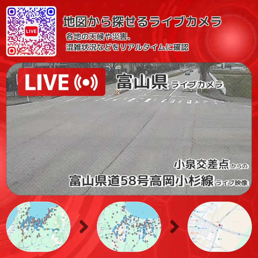 富山県道58号高岡小杉線の他に、小泉交差点や周辺の気象状況も併せてチェックすることが可能で、台風・大雨・地震などの災害による被害状況も把握することができます。