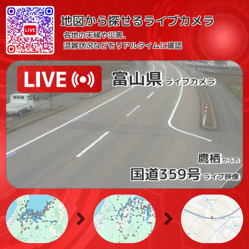 国道359号の他に、苗加西交差点や周辺の気象状況も併せてチェックすることが可能で、台風・大雨・地震などの災害による被害状況も把握することができます。