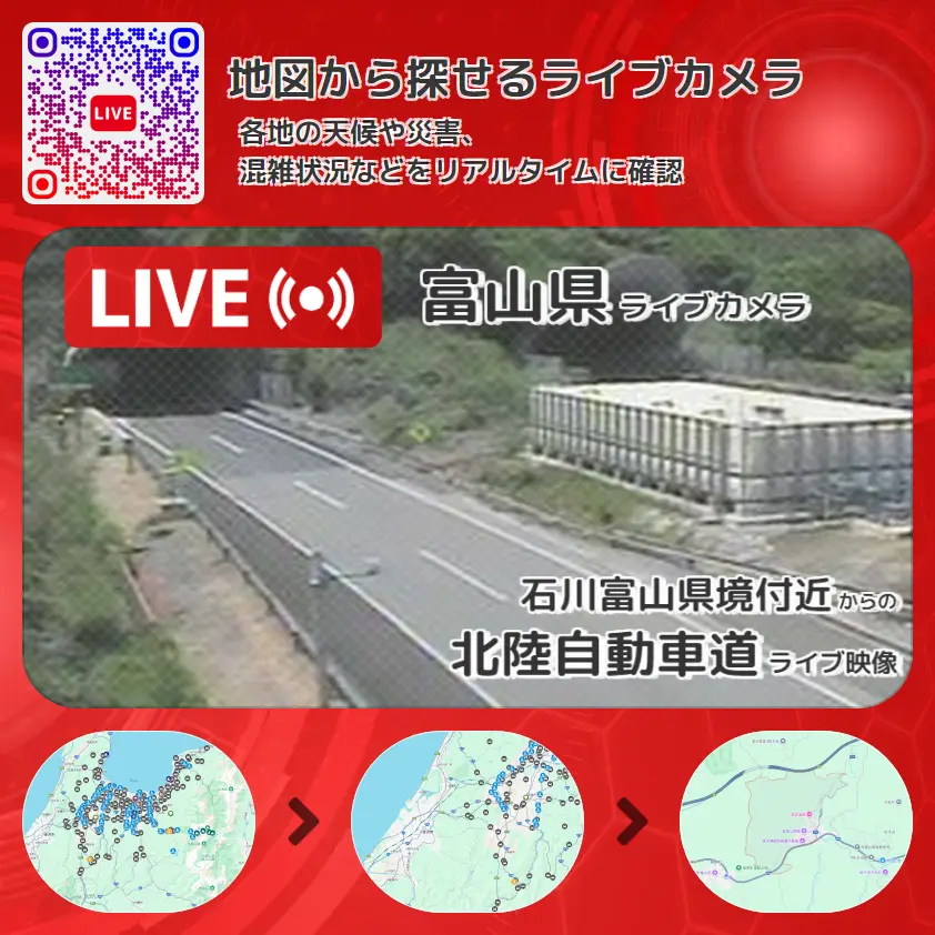石川富山県境付近から、北陸自動車道(北陸道)が確認できるライブカメラです。