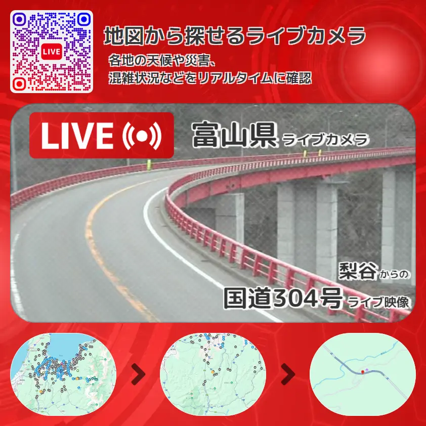 国道304号の他に、梨谷大橋や周辺の気象状況も併せてチェックすることが可能で、台風・大雨・地震などの災害による被害状況も把握することができます。