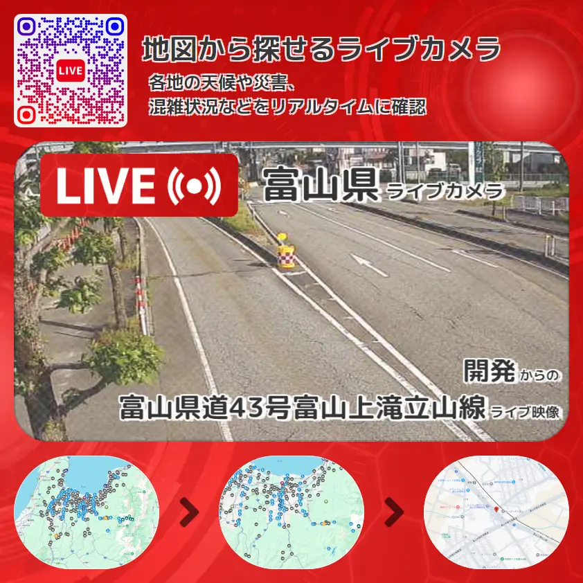 富山県道43号富山上滝立山線の他に、富山県道187号荒屋敷月岡町線や周辺の気象状況も併せてチェックすることが可能で、台風・大雨・地震などの災害による被害状況も把握することができます。