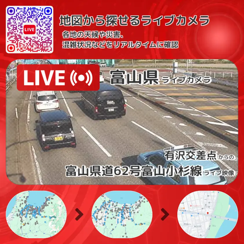 富山県道62号富山小杉線の他に、富山県道7号富山八尾線や周辺の気象状況も併せてチェックすることが可能で、台風・大雨・地震などの災害による被害状況も把握することができます。