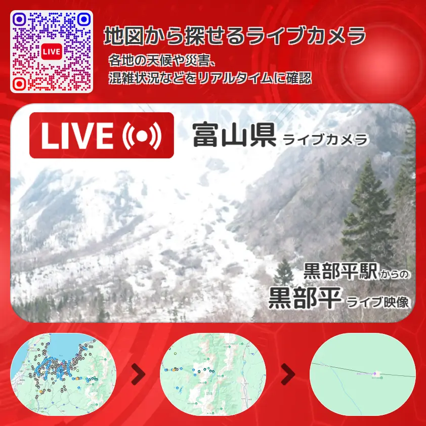 黒部平の他に、立山や周辺の気象状況も併せてチェックすることが可能で、台風・大雨・地震などの災害による被害状況も把握することができます。