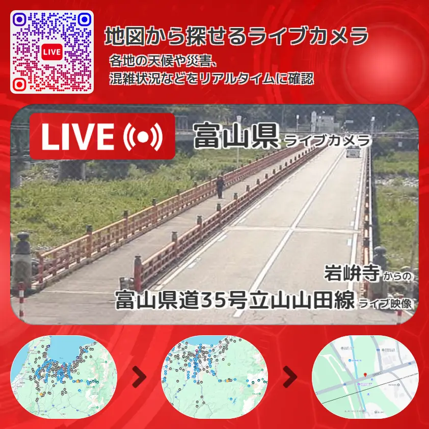 富山県道35号立山山田線の他に、常願寺川や周辺の気象状況も併せてチェックすることが可能で、台風・大雨・地震などの災害による被害状況も把握することができます。