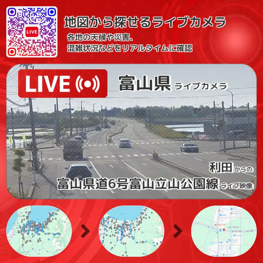 富山県道6号富山立山公園線の他に、富山県道68号富山外郭環状線や周辺の気象状況も併せてチェックすることが可能で、台風・大雨・地震などの災害による被害状況も把握することができます。