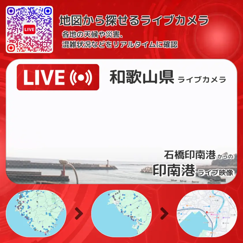 印南港の他に、国道42号や周辺の気象状況も併せてチェックすることが可能で、台風・大雨・地震などの災害による被害状況も把握することができます。