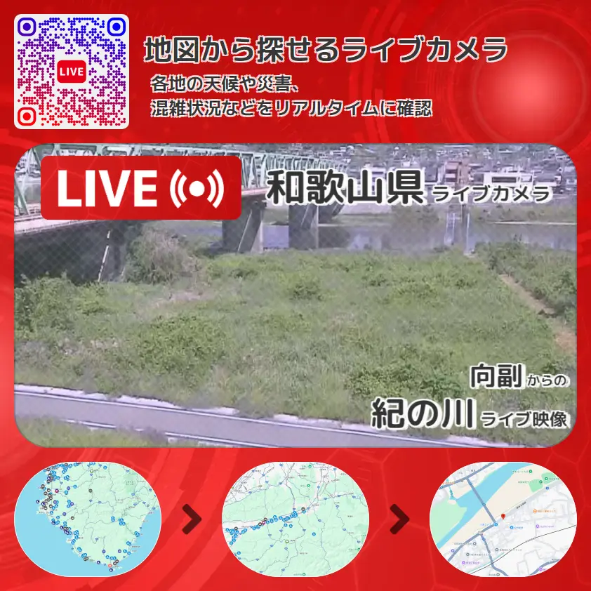 紀の川(紀ノ川)の他に、向副緑地グランドや周辺の気象状況も併せてチェックすることが可能で、台風・大雨・地震などの災害による被害状況も把握することができます。