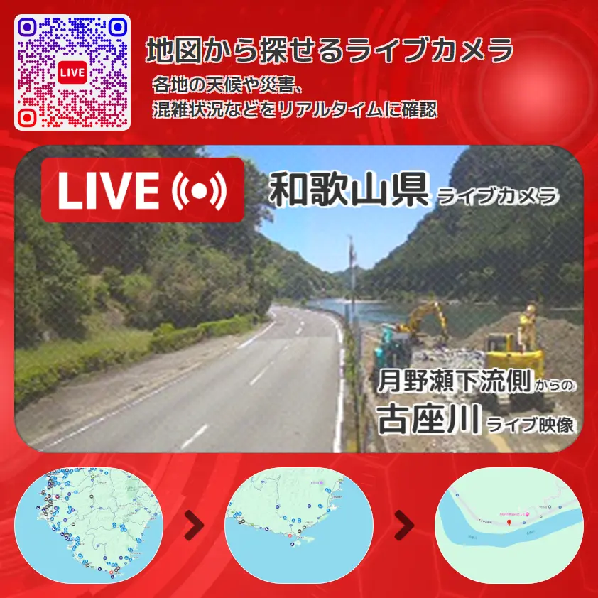 古座川の他に、和歌山県道38号すさみ古座線や周辺の気象状況も併せてチェックすることが可能で、台風・大雨・地震などの災害による被害状況も把握することができます。