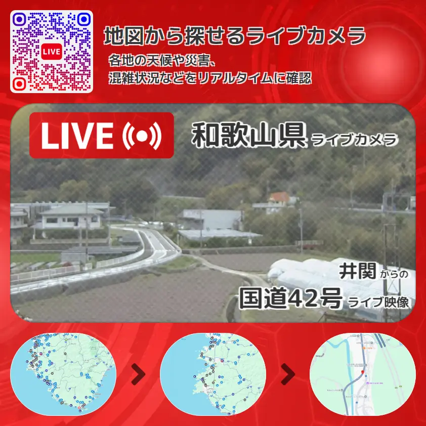 国道42号の他に、広川や周辺の気象状況も併せてチェックすることが可能で、台風・大雨・地震などの災害による被害状況も把握することができます。