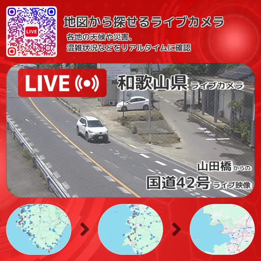 周辺の気象状況も併せてチェックすることが可能で、台風・大雨・地震などの災害による被害状況も把握することができます。