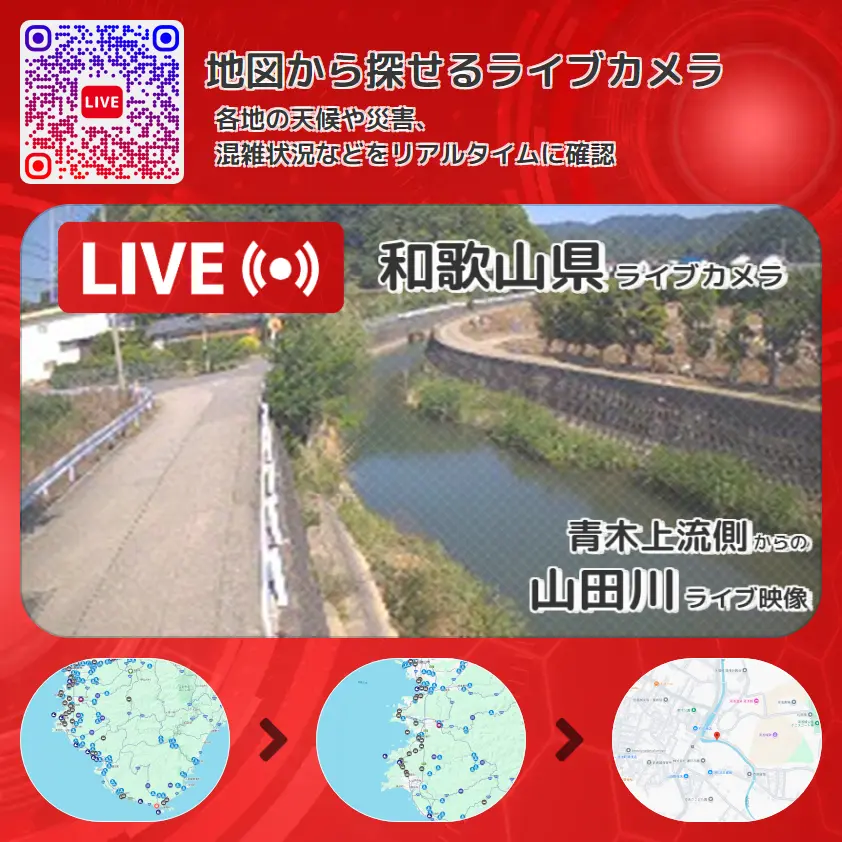 山田川の他に、湯浅城跡や周辺の気象状況も併せてチェックすることが可能で、台風・大雨・地震などの災害による被害状況も把握することができます。