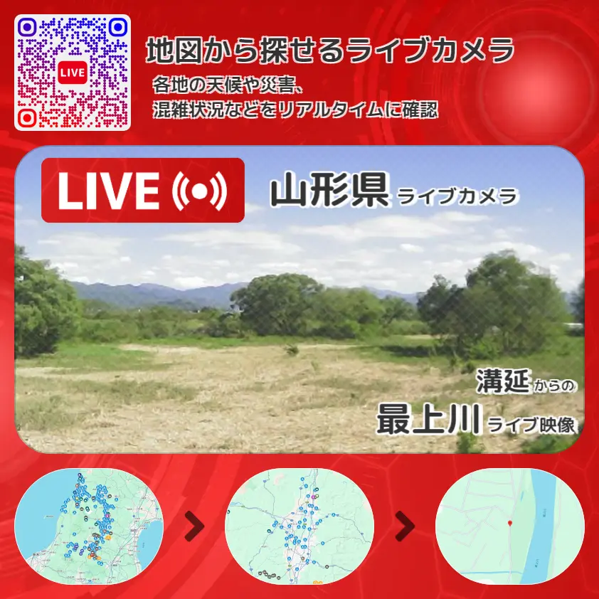 最上川の他に、最上川寺川合流地点方面や周辺の気象状況も併せてチェックすることが可能で、台風・大雨・地震などの災害による被害状況も把握することができます。