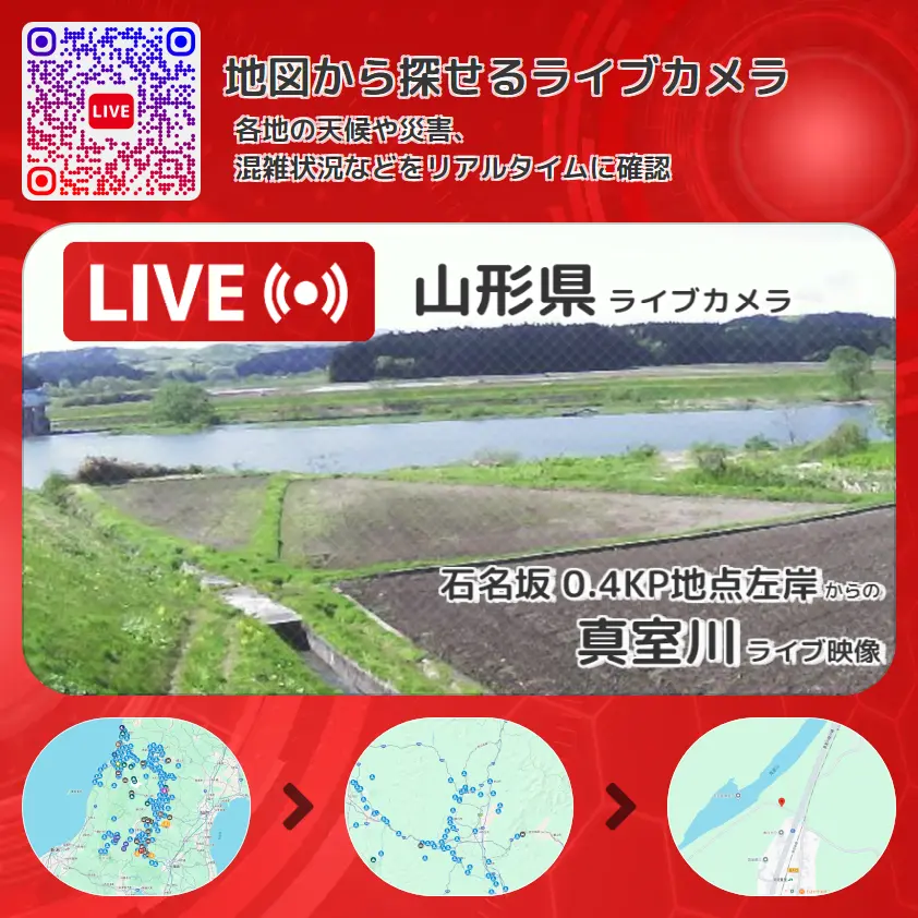 真室川の他に、真室川鮭川合流地点方面や周辺の気象状況も併せてチェックすることが可能で、台風・大雨・地震などの災害による被害状況も把握することができます。