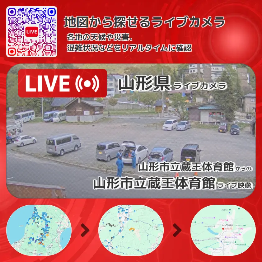 山形市立蔵王体育館の他に、蔵王体育館駐車場や周辺の気象状況も併せてチェックすることが可能で、台風・大雨・地震などの災害による被害状況も把握することができます。